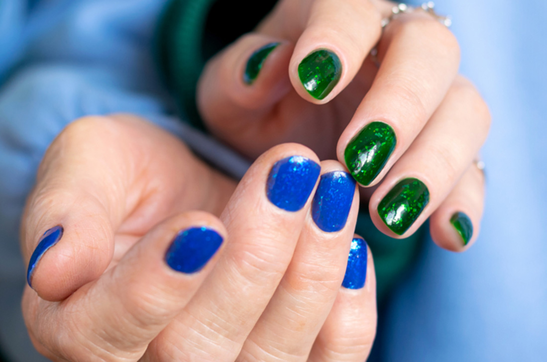 Красивые лаки в оттенке бутылочного стекла со слюдой в цвет лака